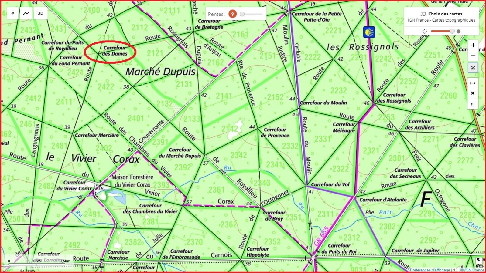 La première carte localise de façon précise l'emplacement du carrefour. La seconde carte représente une vue aussi large que possible de la forêt de Compiègne avec le carrefour concerné. La seule condition est que ce soit lisible.